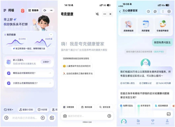 不仅是蚂蚁阿福,还有夸克健康,还有文心健康管家,讯飞晓医。腾讯做了啥 AI 健康管家,我还真说不上。。。